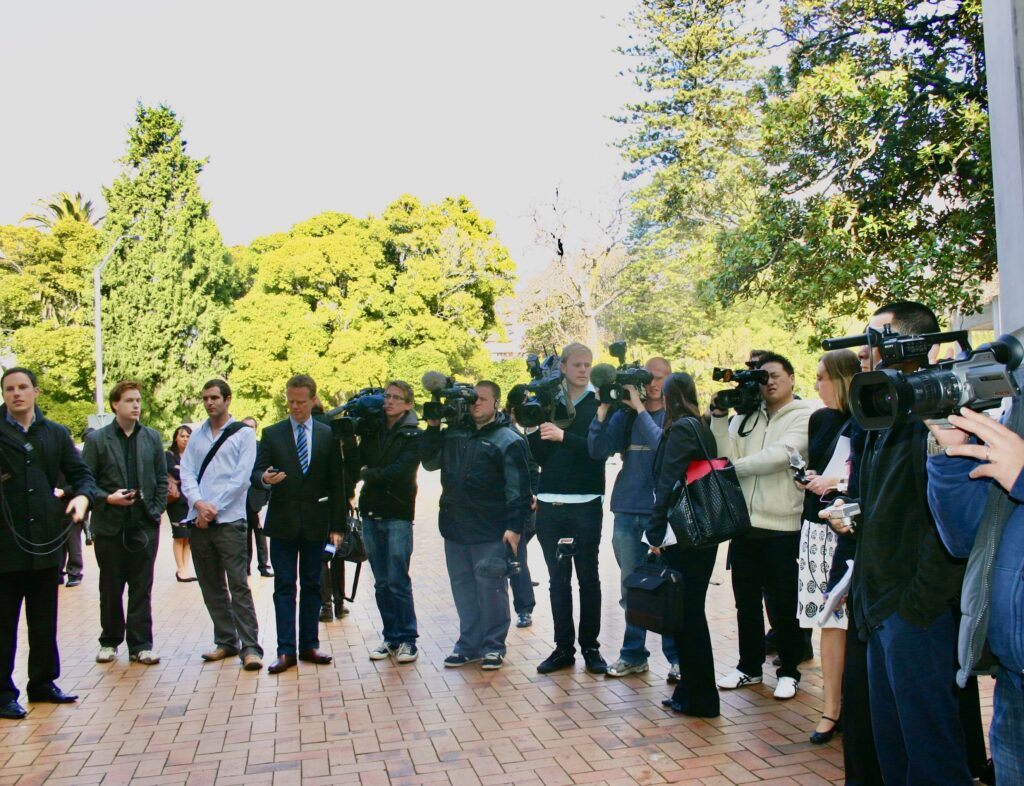 走出奥克兰高院,看到外面已经站满了记者,他们是在等候律师出来并进行采访。