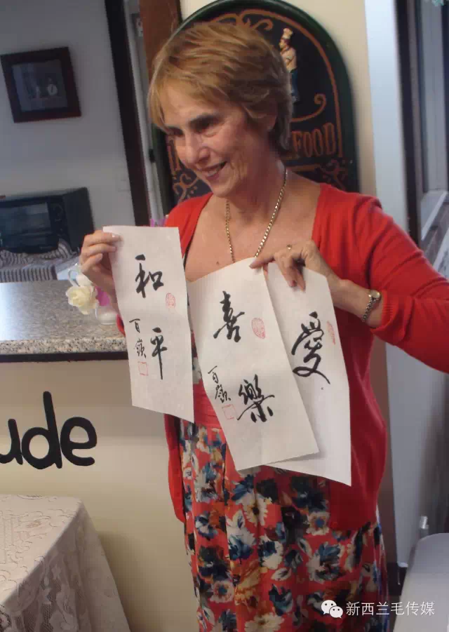 华人书法家将书写的汉字送给Heather