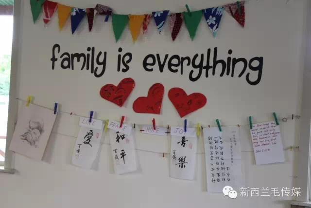 家庭中心的墙上挂着华人朋友送的中文条幅