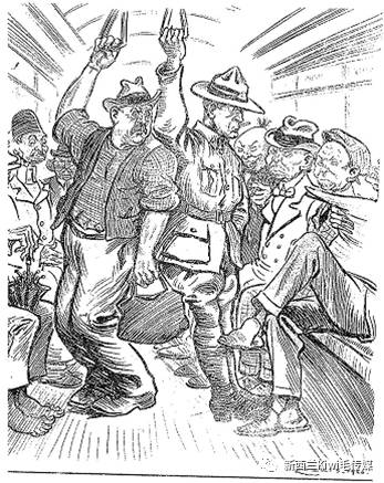 这幅漫画上,公共汽车两边的椅子坐的都是面目狰狞的华工。而中间站的是新西兰工人和退伍兵。