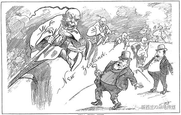 上面这幅漫画上,面目狰狞的华人一个个用跳高的竹竿撑着跳进新西兰,虽然要缴纳高达100英磅的人头税(竹竿上写有“100英镑人头税”),也挡不住华人的涌入。而图上的新西兰人则显得那么束手无策。