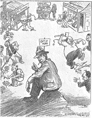 漫画表现的是二次世界大战后,新西兰工人和为国参战的士兵认为华工抢走了他们的工作。