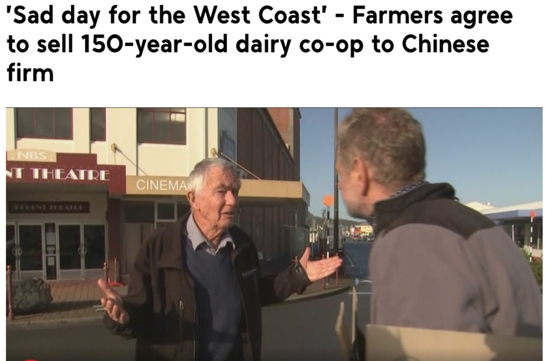 新西兰电视台报道的题目是:《西海岸悲哀的一天 – 奶农同意把150年历史的合作社卖给中国公司》