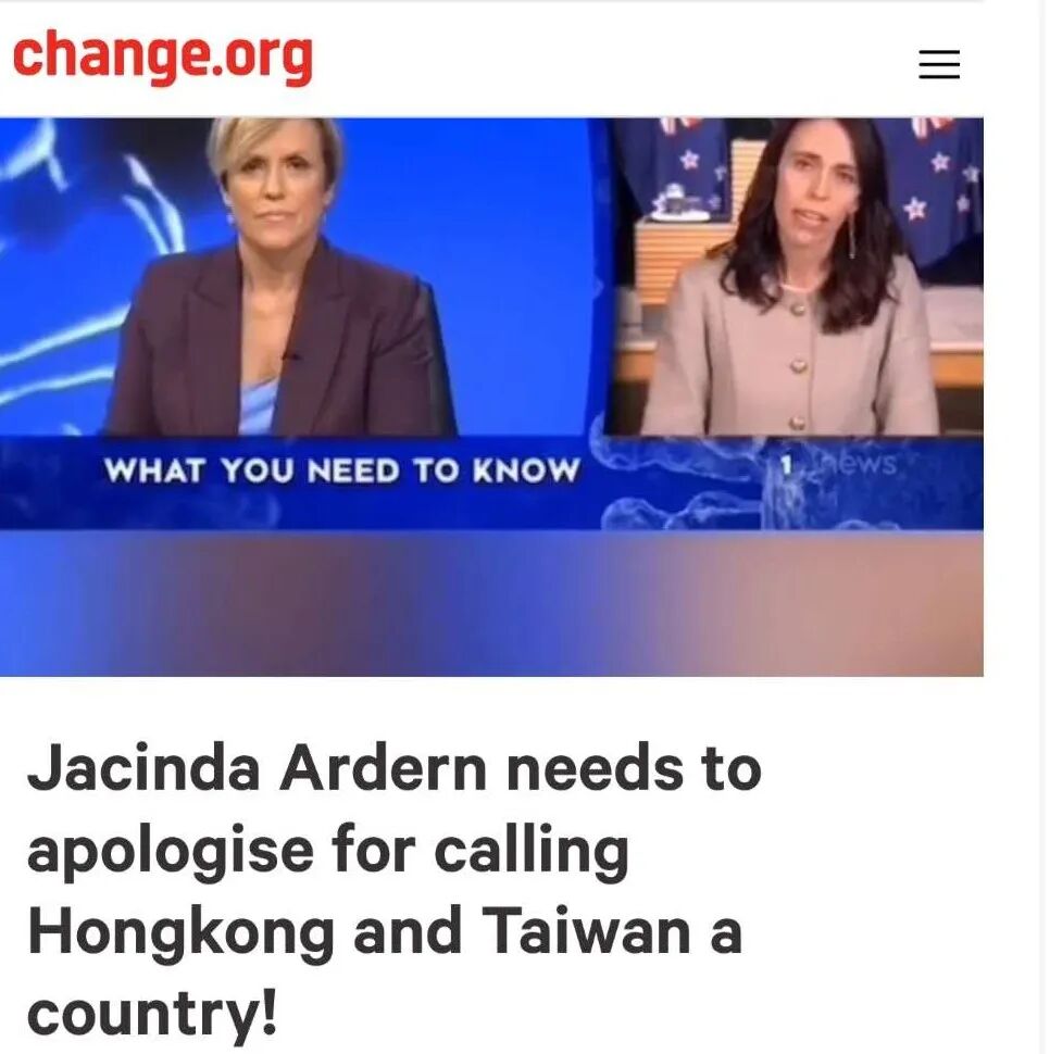 要求新西兰总理道歉的请愿信,标题是《杰辛达·阿登把香港和台湾说成国家需道歉》