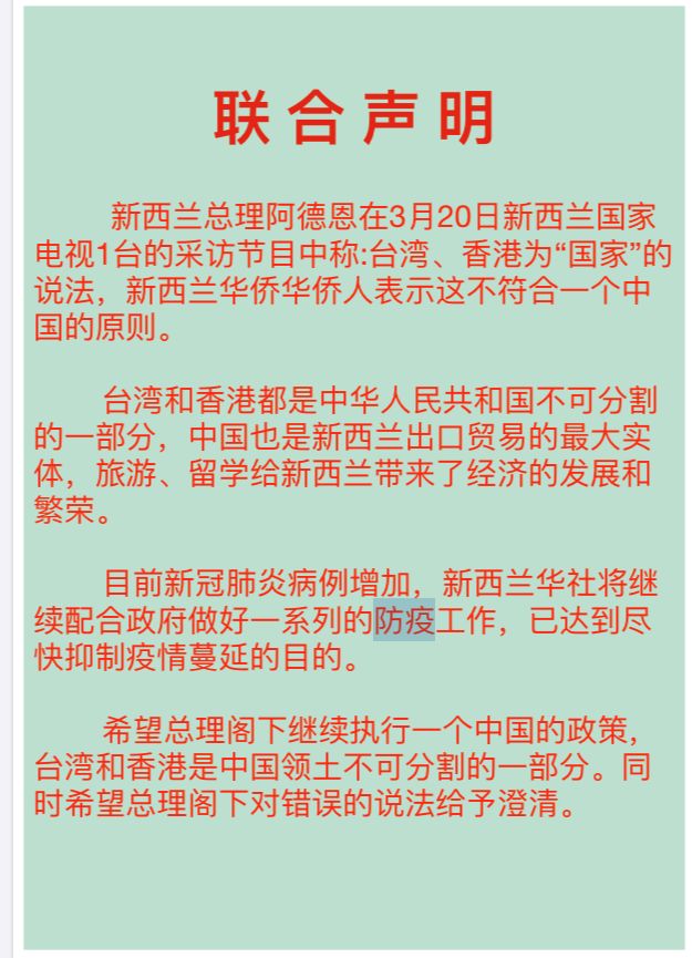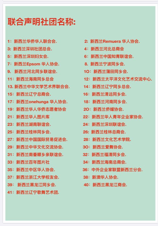 无独有偶,除了“新西兰和平之友联谊会”的“严重抗议”书,新西兰华人圈还流传一份不知哪个华人组织发出的“联合声明”,声明要求“总理阁下对错误的说法予以澄清”。这封表述相对平和的联合声明,有40多个社团签名。