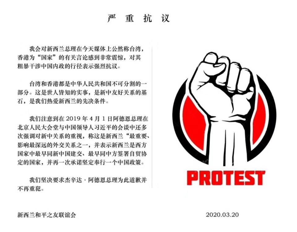 20日晚本记者就此询问发布抗议书的 “新西兰和平之友联谊会”秘书长,但没有得到回复。