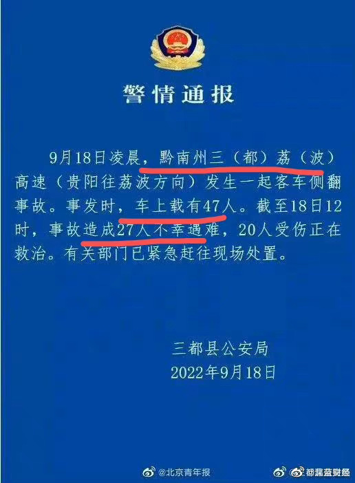 贵州一辆隔离运送大巴车发生重大车祸,27人不幸遇难 NZmao com | 2022-09-18 | 国际新闻 | 没有评论 据网易报道,贵州一辆疫情隔离运送车发生侧翻,已造成27人不幸遇难。 贵州一大巴车凌晨发生重大车祸,27人不幸遇难。 贵州一大巴车凌晨发生重大车祸,27人不幸遇难。 贵州一大巴车凌晨发生重大车祸,27人不幸遇难。 (毛传媒) Related Posts 莫迪称历史性访问乌克兰 劝泽连斯基坐下来与普京谈判 没有评论 | 8 月 24, 2024 纪念第一次世界大战是为了永远珍惜和平 没有评论 | 11 月 12, 2018 澳洲总理莫里森:希望澳中互相尊重 不会在原则问题上做交易 没有评论 | 5 月 15, 2020 在上海工作的乌克兰21岁女模特儿失联一周 没有评论 | 8 月 15, 2016
