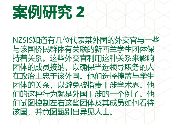 Phil McKee 表示: ”我们在新西兰最常见到的外国干涉形式,是社会层面的干涉(societal interference),