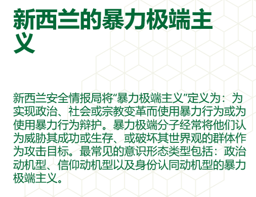 新西兰情报安全局副局长Phil McKee 表示,NZSIS的职责之一,就是应对暴力极端主义与恐怖主义(terrorism)。