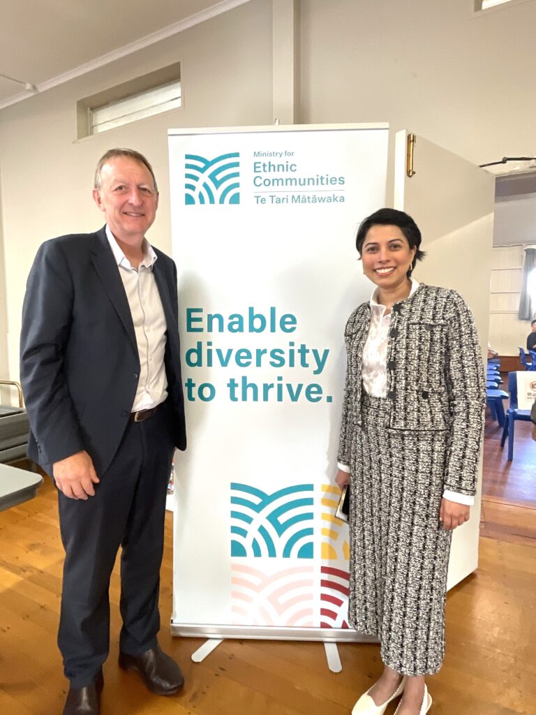 左为NZSIS 副局长 Phil McKee ,右为少数族裔社区部副首席执行官Pratima Namasivayam / 摄影:毛 芃