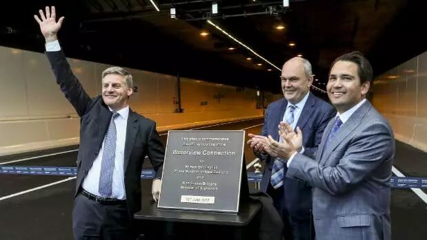 左起:Bill English、Steven Joyce和国家党新党魁Simon Bridges。他们2017年在奥克兰的Water View地下隧道开通仪式上。