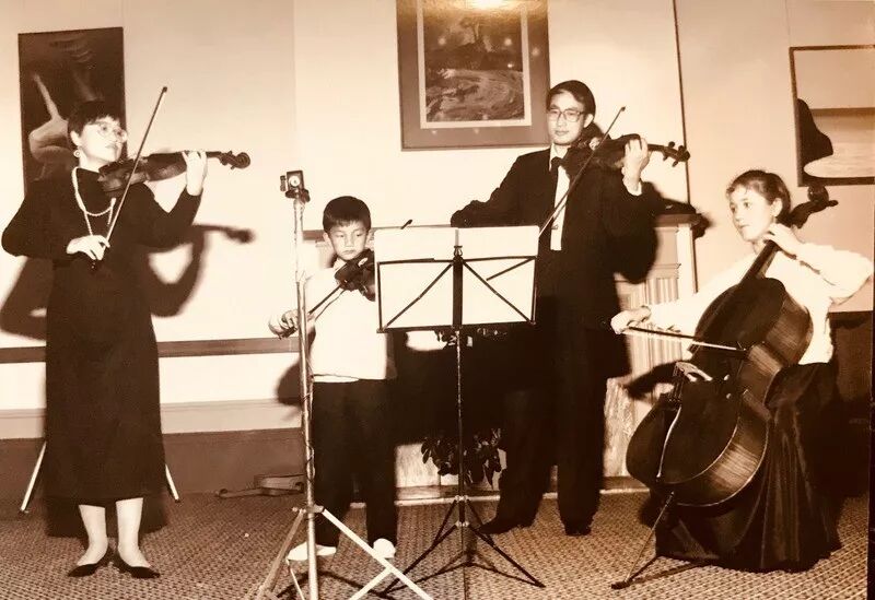 这几张照片都是那天筹款活动时拍的。这一张是华人小提琴家陈炳霖(Binglin Chen) 和太太安娜、儿子查尔斯和另外一个女孩子一起在筹款活动上演出。陈炳霖原来是上海交响乐团的,那时他是新西兰交响乐团唯一的华人。