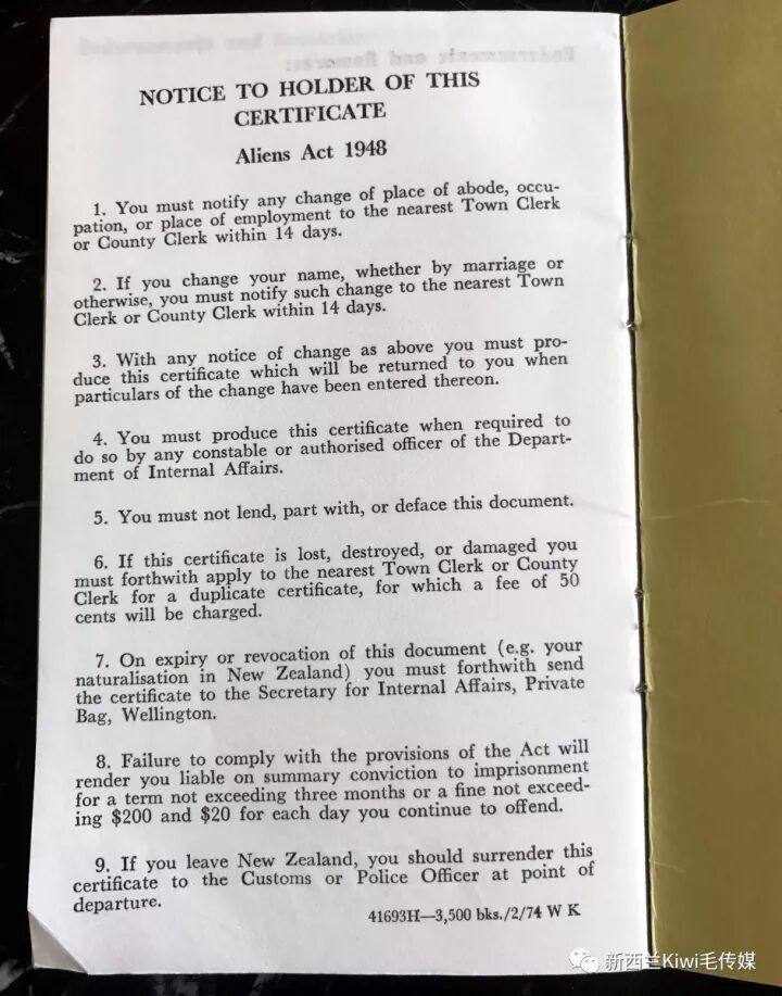 ·人头税可能很多人都知道,知道《外来人登记证》的恐怕不多。新西兰1948年通过Aliens ACT (1948外来人法),根据这一法律,所有非英国属民,都要持外来人登记证。