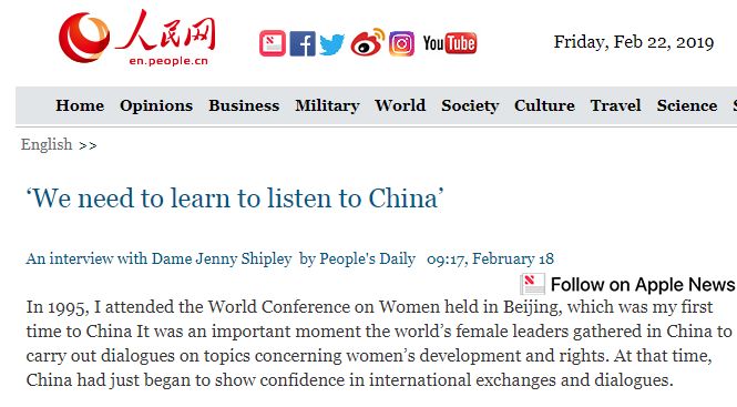 其实,就在Mainzeal公司破产纠纷案的裁决公布前,希普利就已经是媒体关注的焦点,事缘中国共产党机关报人民日报旗下的英文网站China Daily发表了一篇由希普利署名的评论文章 ,标题是《我们需要倾听中国》。