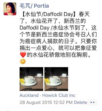 我的微信朋友圈上,还记载着我们2015年8月见面喝咖啡的记录,那天是在奥克兰东区Howick一个俱乐部,时值南半球的初春,正好是新西兰的水仙花节。聊天的时候,我顺手在朋友圈发了张照片,写了几句话。 结果,珂珂当即跟帖,不假思索写了几行鼓动大家购买水仙花支持癌症基金的话。