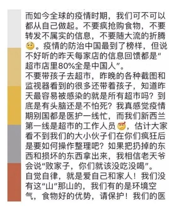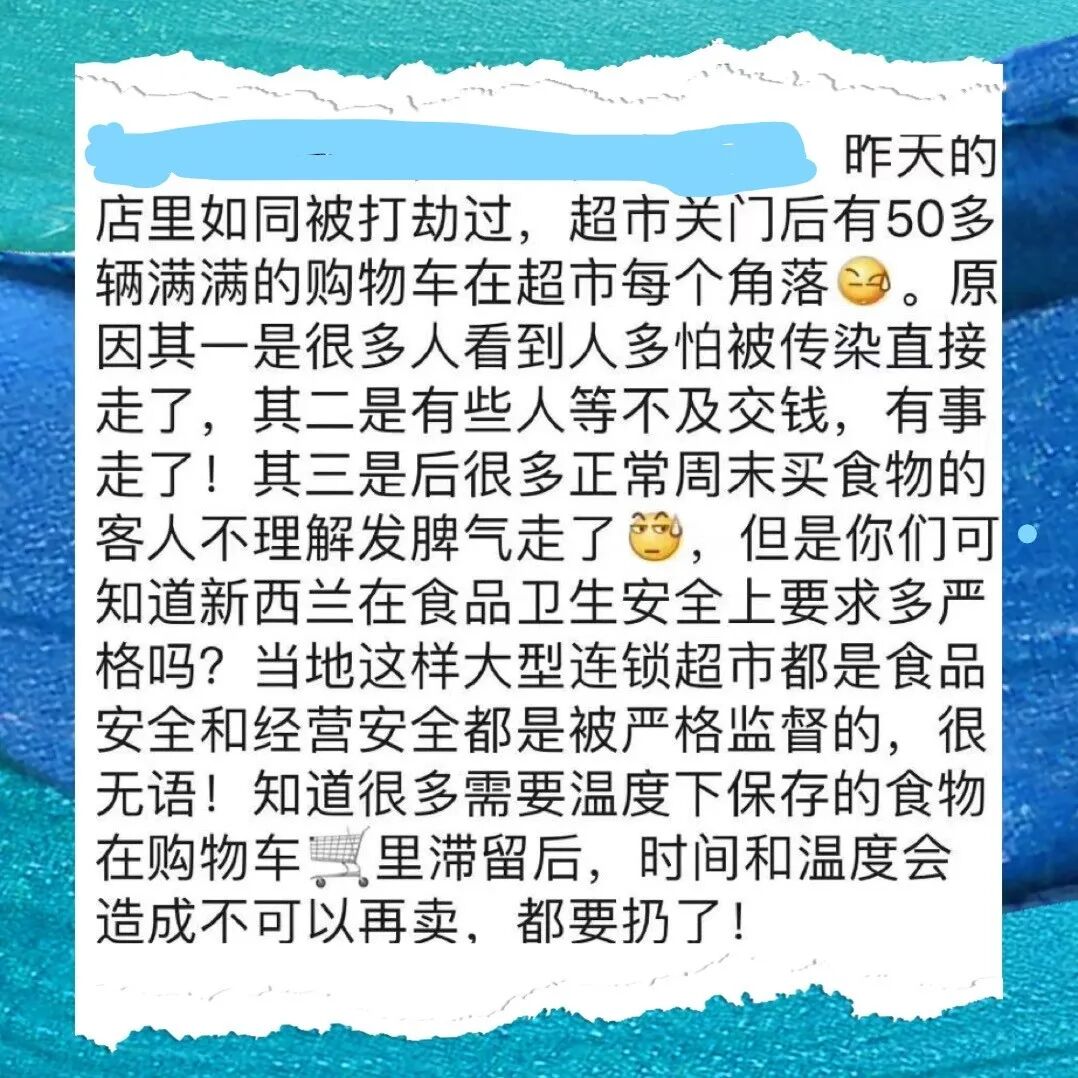 看见朋友圈里发的华人在超市排队抢购粮食甚至厕所纸,货架被一抢而空,实在忍不住想吐槽那些自造恐慌之人,别再丢人显眼了,新西兰饿不死人!