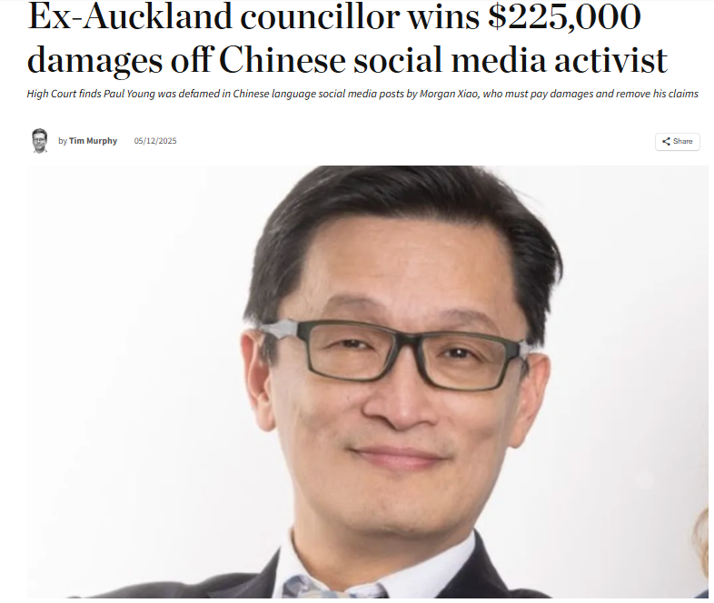 前奥克兰市议员 Paul Young 在一宗诽谤案中胜诉,被告是活跃在社交媒体的声名狼藉的肖志鸿(魔王/Morgan Xiao)。案件涉及其在中国社交平台微信上发布的多篇帖子,这些帖子被指控暗示 Young 不适合担任公职,并受到外国势力影响。
