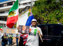 抗议人群携带扩音器,从上午10点左右就开始在伊朗驻新西兰大使馆外高喊各种抗议口号。
